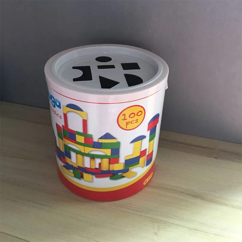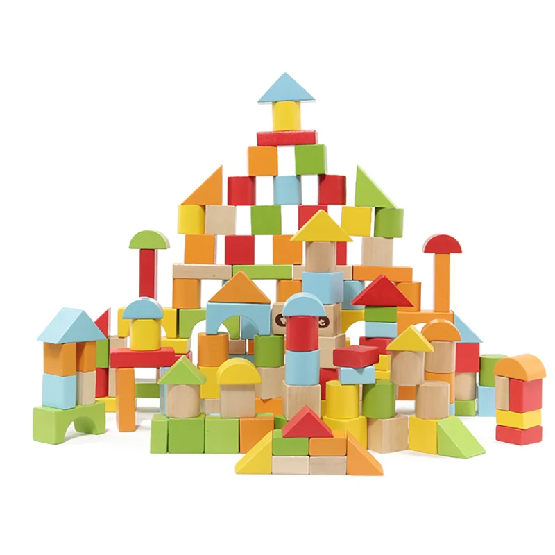 - Il set include 100 blocchi di costruzione in legno di varie forme e colori.